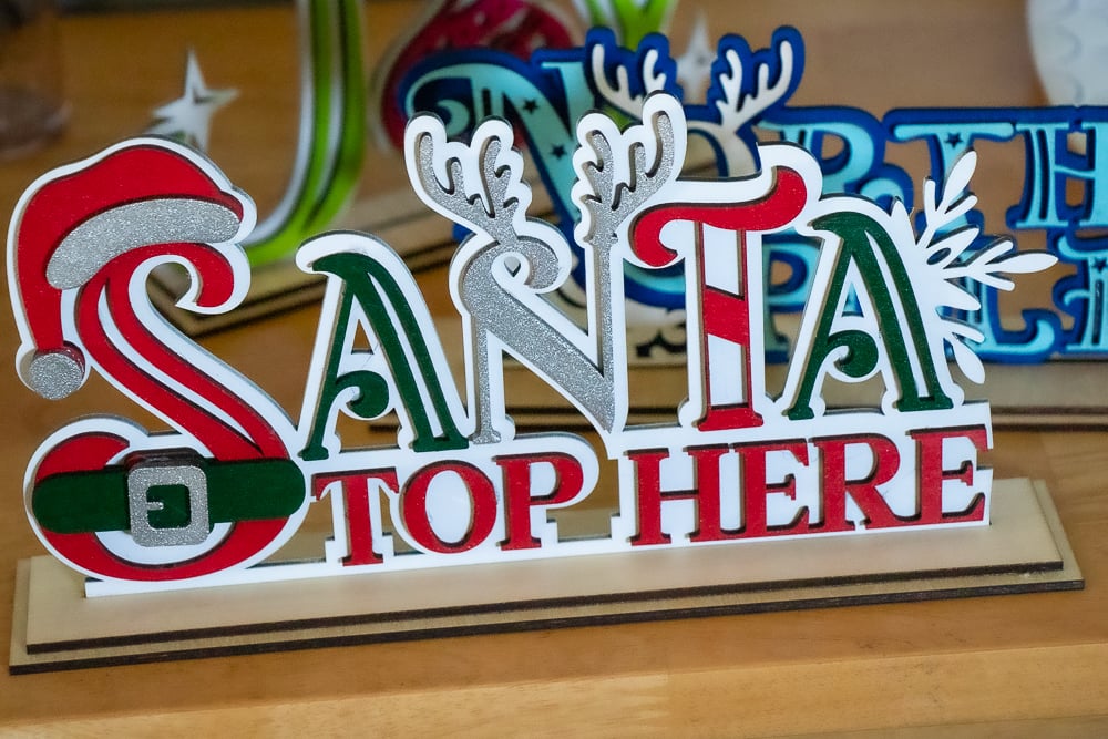Get ready to elevate your decor for the holidays with this laser cut Santa Stop Here! This table sign includes a wooden stand that is cut to fit perfectly with the sign. You can also attach a magnet to the back, making it easy to hang on your refrigerator, office shelf, or anywhere you'd like for added fun. This is perfect for adding charm to your mantel or table decor. This sign will brighten up any space!