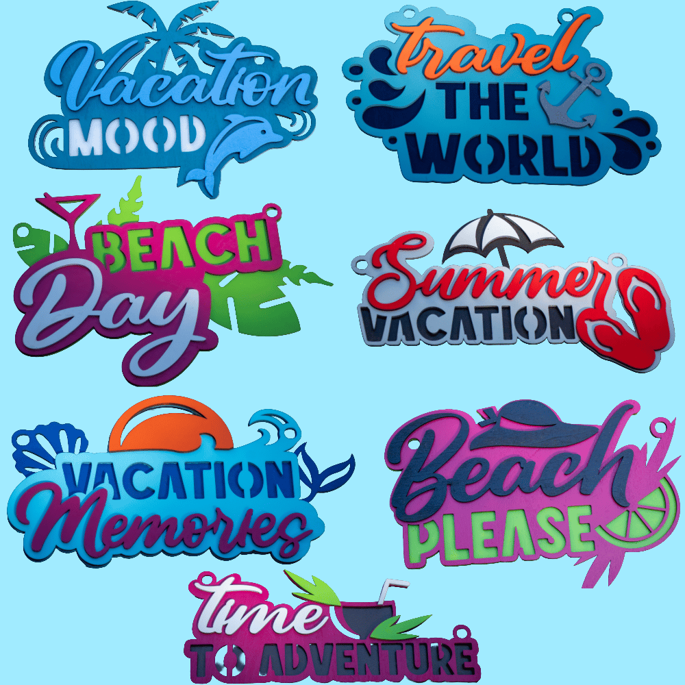Pick your favorite sign from "Vacation Mood", "Travel the World", "Beach Day", "Summer Vacation", "Vacation Memories", "Beach Please", and "Time to Adventure". Pick your favorite signs or buy them all!
