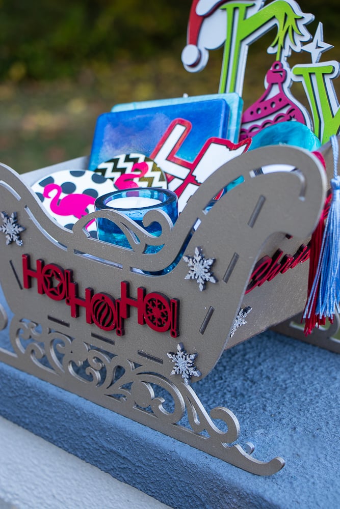 Santa's sleigh is laser cut and filled with items to show you care and are thinking about your family, friends, coworkers, employees, and colleagues. This is a fun gift for anyone in your life!